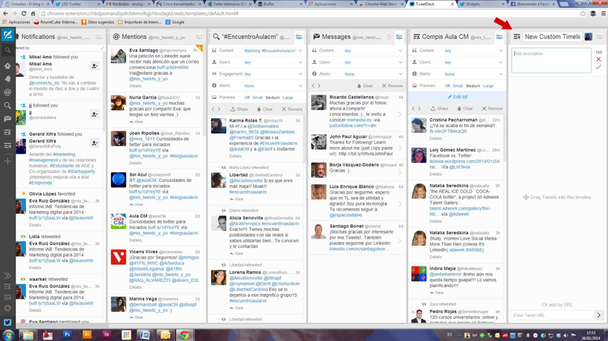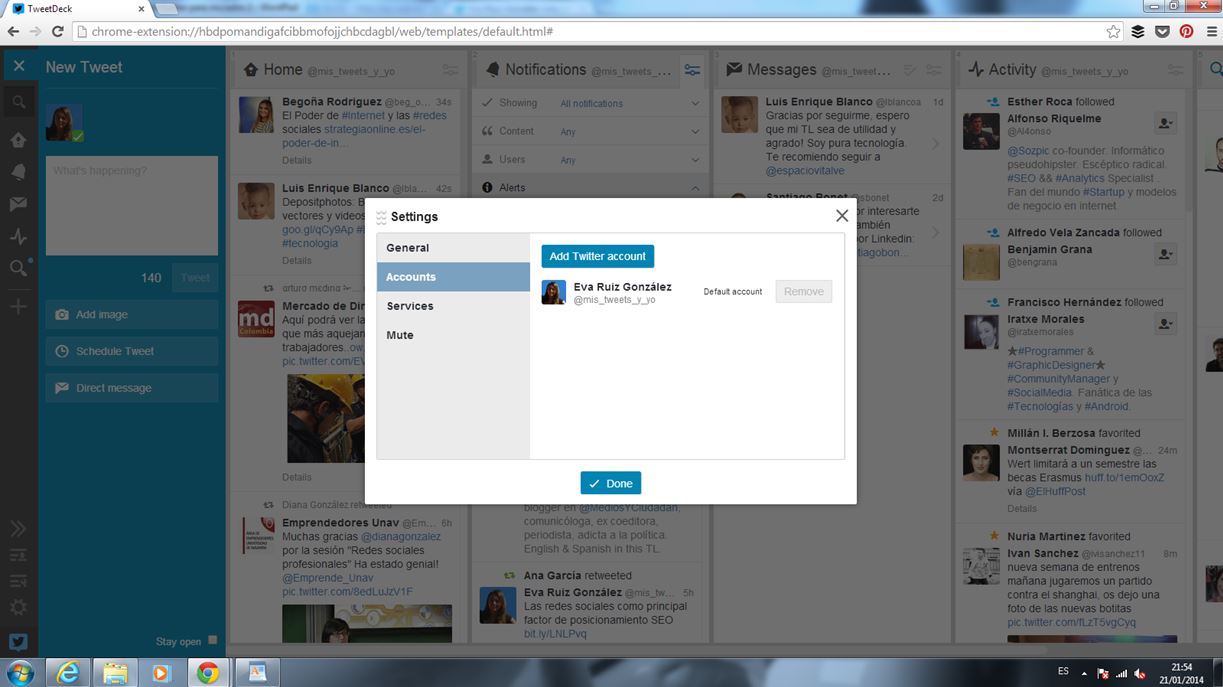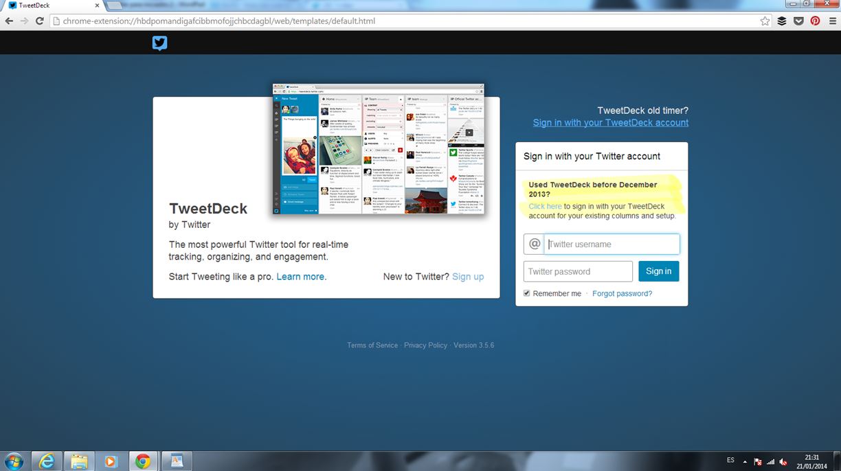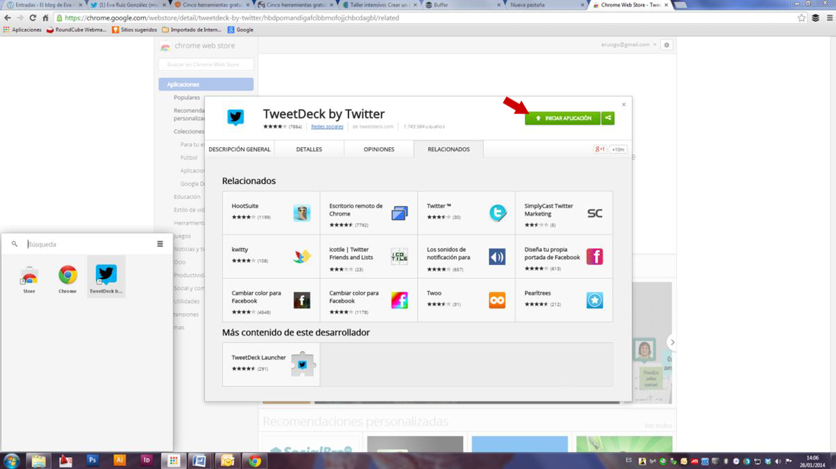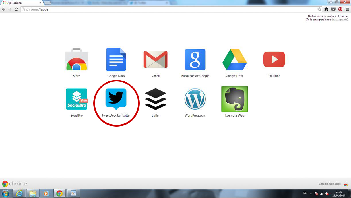TweetDeck es una aplicación que deberás instalar en tu ordenador. Para ello abre el Google Chrome (olvídate de otro navegador), buscar TweetDeck by Twitter en el Chrome Web Store (tanto por vía web como a través de un icono que aparece en el apartado «Aplicaciones» del navegador) y pulsar el botón «+ GRATIS» para descargarla.