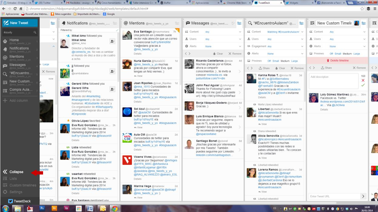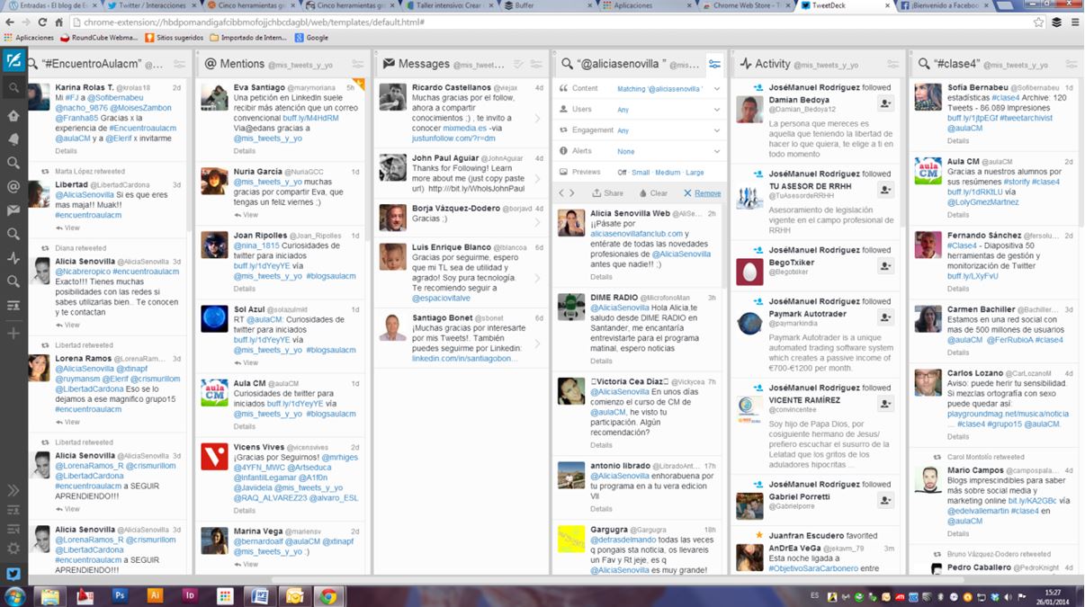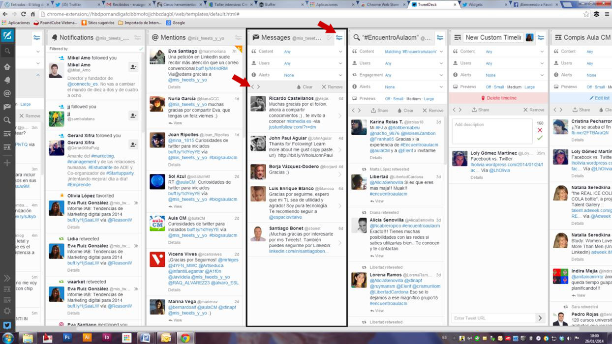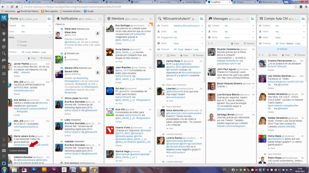 Si en el recuadro anterior pulsamos el botón «Get Started» veremos una pantalla con muchas columnas, de forma que en un solo golpe de ojo tendremos todas las opciones típicas de twitter (Inicio, @Conecta, Descubre, MD, etc.)