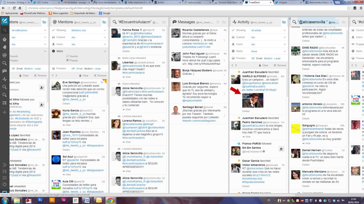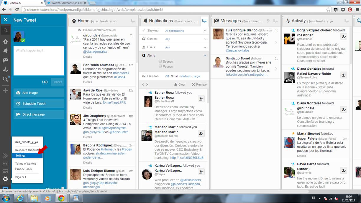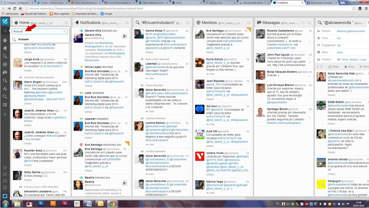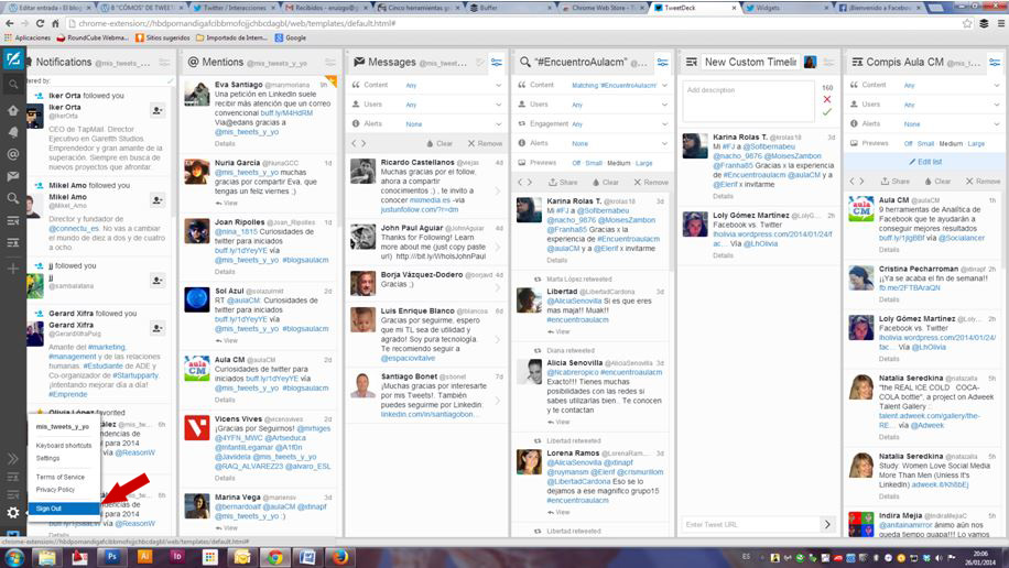 Si en el recuadro anterior pulsamos el botón «Get Started» veremos una pantalla con muchas columnas, de forma que en un solo golpe de ojo tendremos todas las opciones típicas de twitter (Inicio, @Conecta, Descubre, MD, etc.)