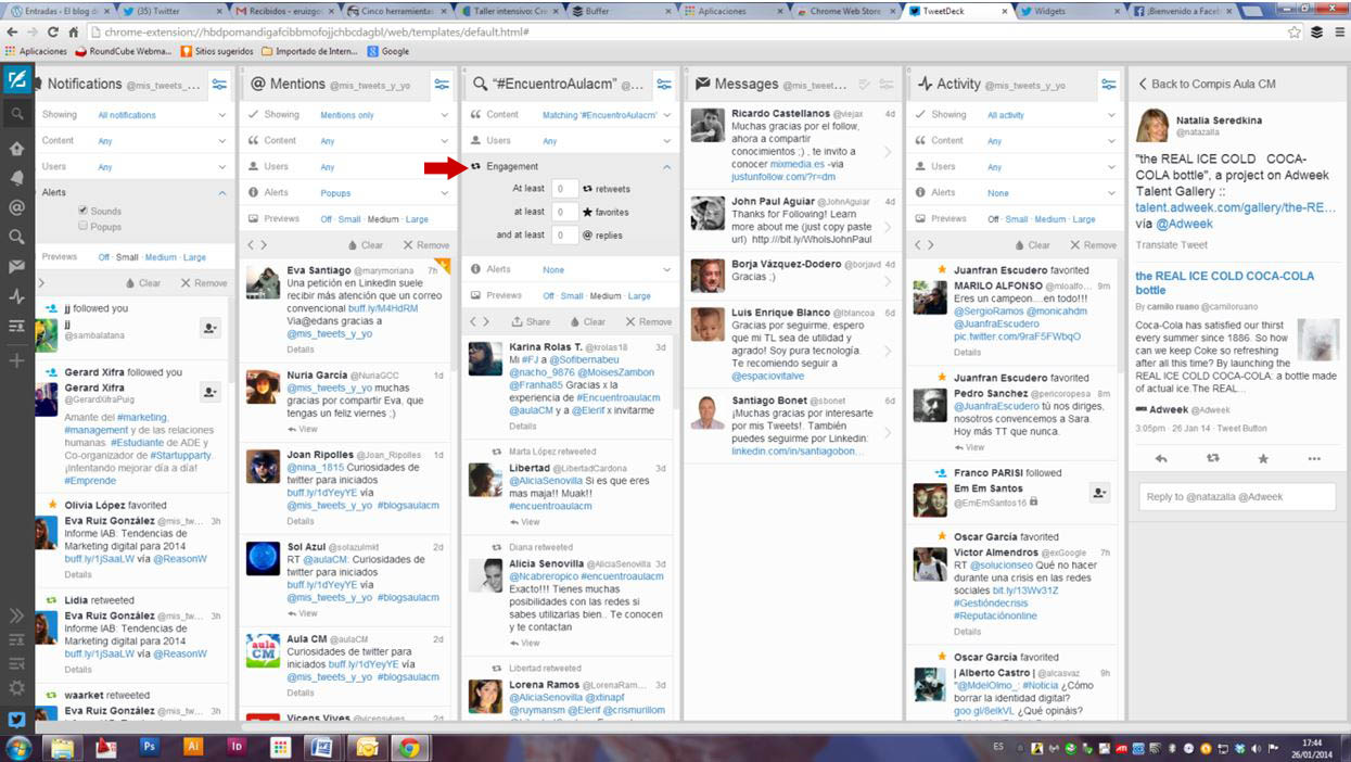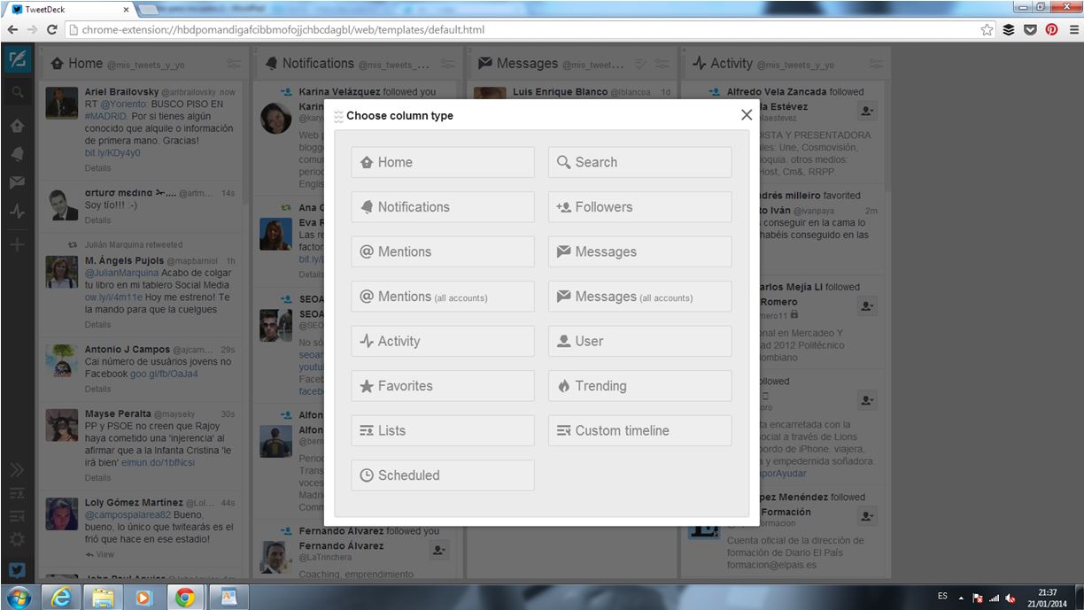 En TweetDeck podemos elegir las columnas que deseemos emplear y las que no (por ejemplo, la columna «Activity» nos muestra lo que está pasando, y como se actualiza constantemente puede que queramos eliminarla para no marearnos. En cambio, es interesante tener como columna una de mensajes directos (que podremos contestar directamente desde la aplicación) o las notificaciones y menciones (los que nos siguen, nos mencionan, etc).