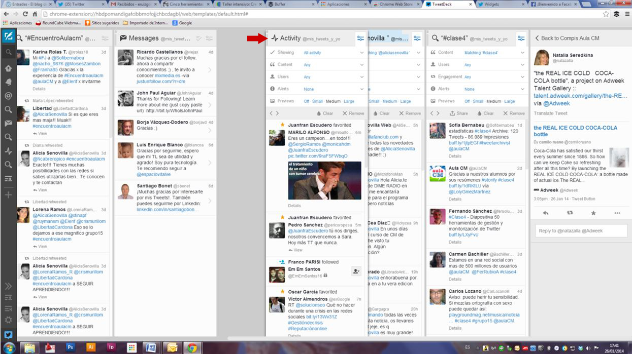 NOTA: La diferencia entre la columna Home y Activity es que en la primera encontraremos todos los tuits de las personas a las que seguimos (como nuestra pantalla de Inicio en twitter) y en la segunda iremos viendo las publicaciones de todo el mundo.