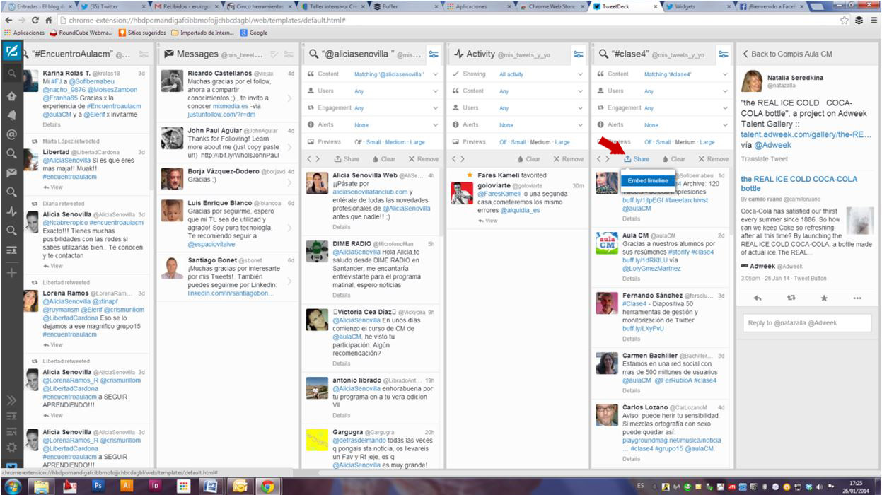 Si en cambio elegimos la opción «Share» añadiremos a twitter una cronología pública de nuestro TweetDeck. Al pulsar en esta opción nos saldrá la indicación «Embeb timeline» (Incrusta la línea de tiempo) y si volvemos a pulsar nos llevará a nuestro twitter para configurar la TL.