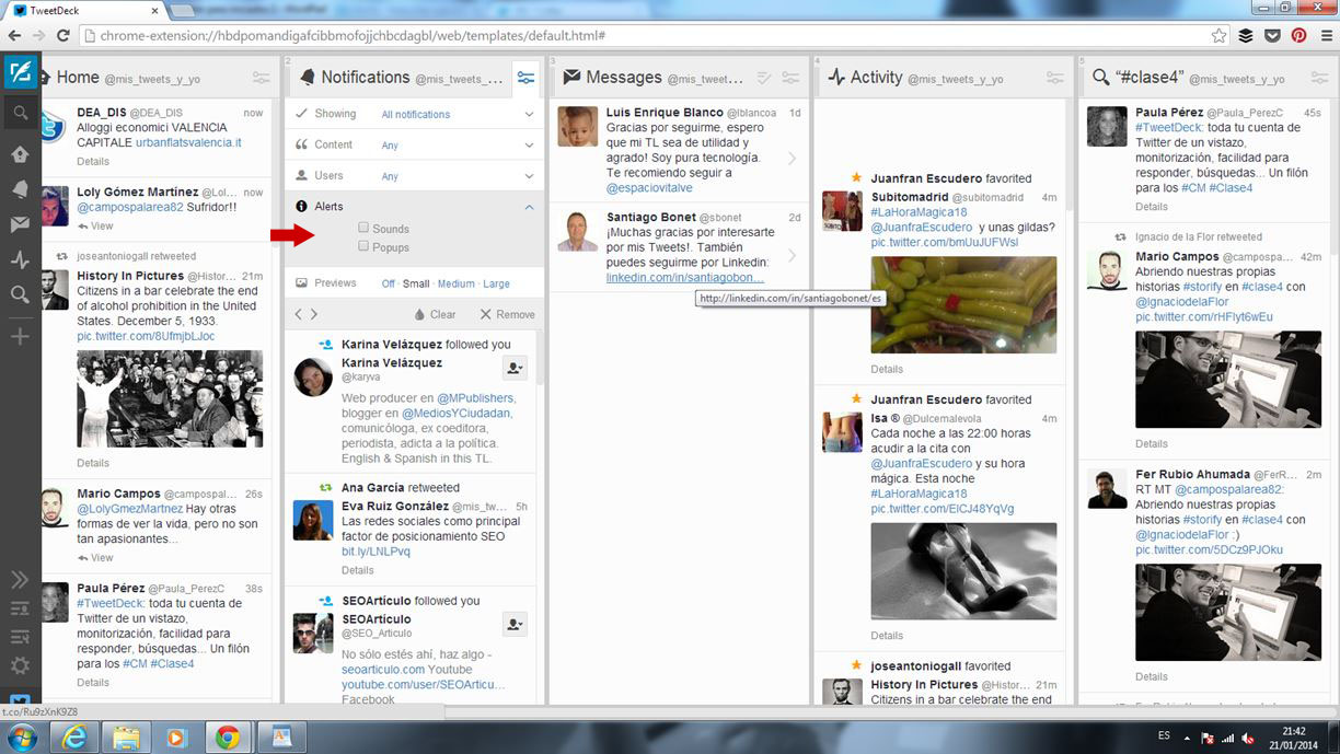 En TweetDeck podemos añadir alertas a cada columna para que nos avise cada vez que se publique o suceda algo (por ejemplo cada vez que alguien nos haga una mención, cada vez que recibamos una notificación, etc.)