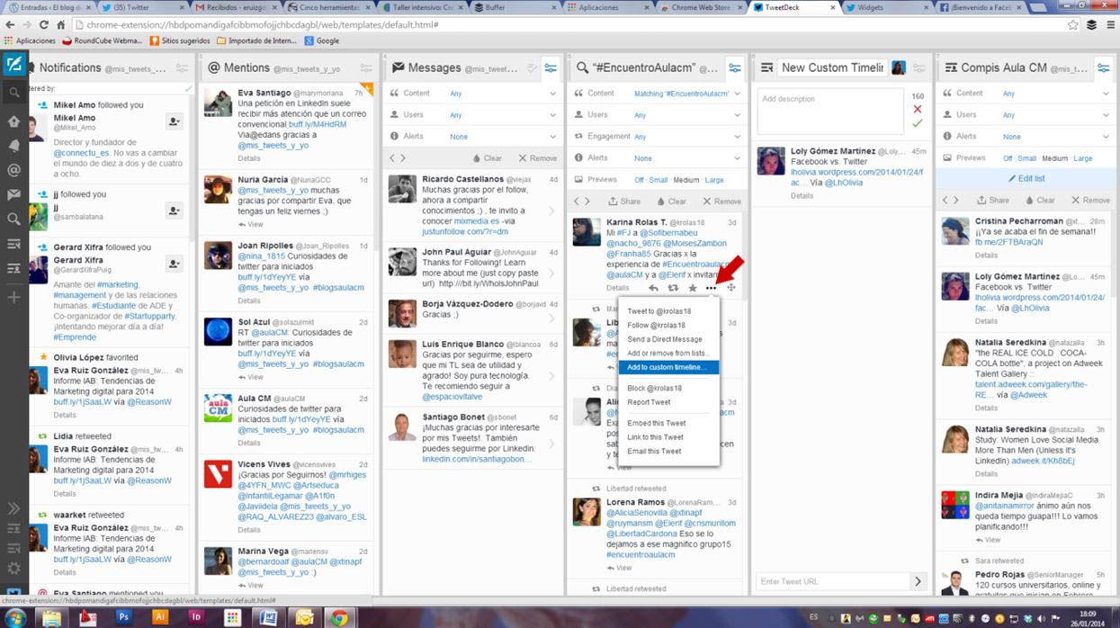 Para arrastrarlos, pulsaremos en el icono de dos flechas que aparece en cada tuit al pasar por encima el cursor y arrastraremos con el cursor a nuestra columna. El tuit elegido se nos añadirá a la columna personalizada.