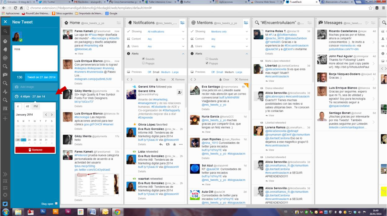 Si pulsamos en Schedule Tweet nos aparece un calendario donde le indicaremos fecha y hora (cuando terminemos nos habrá modificado el botón «Tweet» por «Tweet on XX/ZZ/2014«.