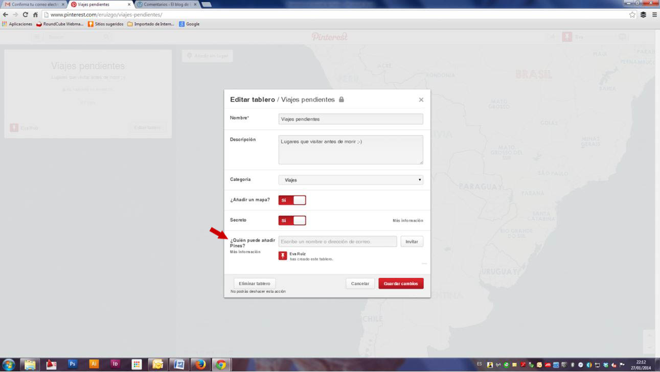 Si cerramos y pulsamos en Editar tablero nos devolverá al recuadro anterior con un añadido: «Quién puede añadir pines«, donde podremos colocar el correo electrónico de personas a las que invitaremos al tablero para que coloque sus pines o imágenes, de forma que por ejemplo podremos crear un grupo de viaje y acceder todos al mismo tablero.