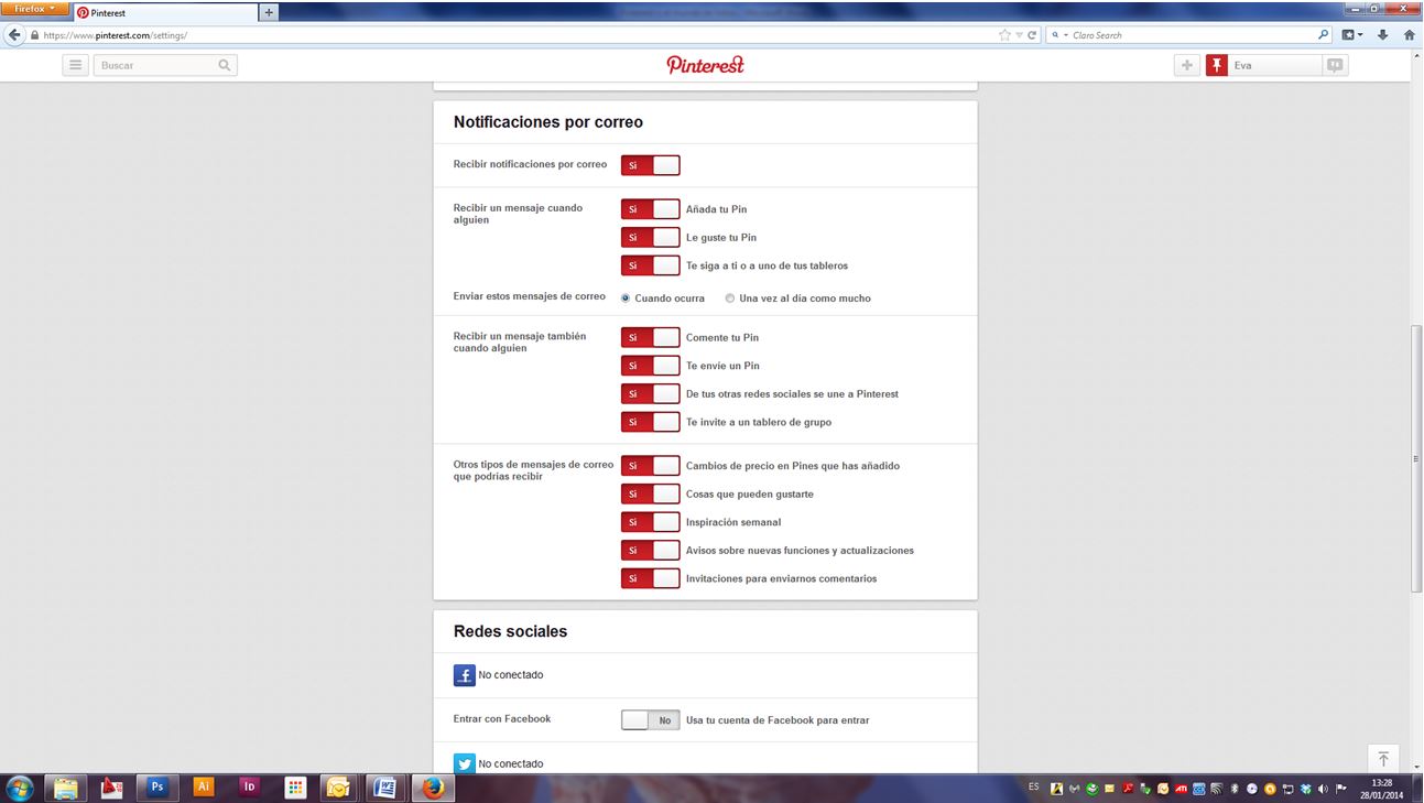 Más abajo podremos configurar nuestras notificaciones de correo, para controlar qué queremos que nos llegue (ej. sólo cuando alguien nos siga, o cada vez que pineen una foto, o comenten un pin, etc.)