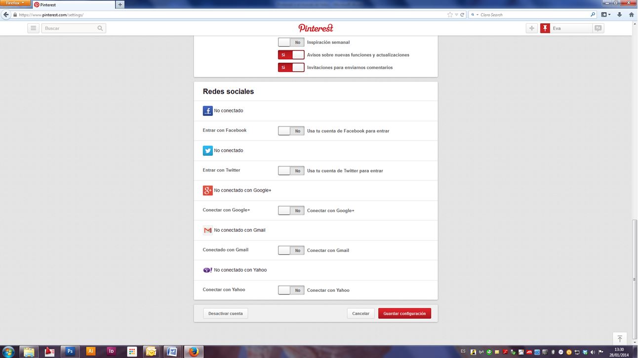 * Nuestro Nombre de Usuario, donde tendremos un desplegable con varias opciones (configuración de nuestra cuenta, buscar amigos, seguir tableros, enlazar a otras redes como twitter, facebook, etc.). Más tarde veremos cómo configurarla.
