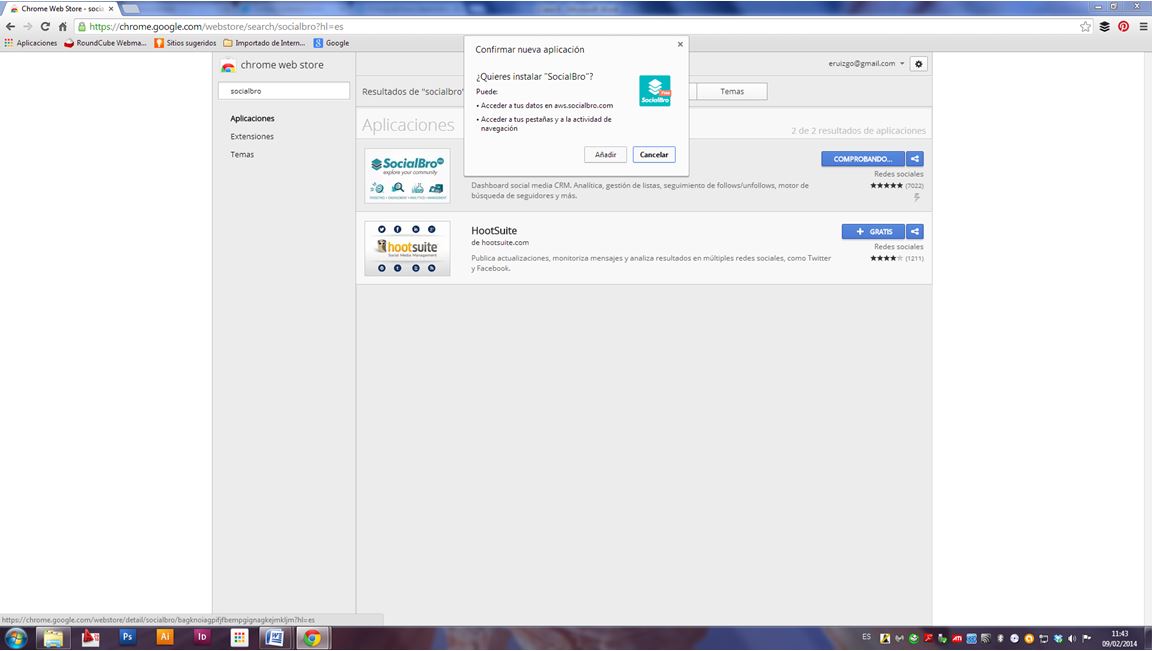 Desde la web store de Google Chrome, buscamos SocialBro y nos descargamos la aplicación para incluirla en la pantalla de aplicaciones: