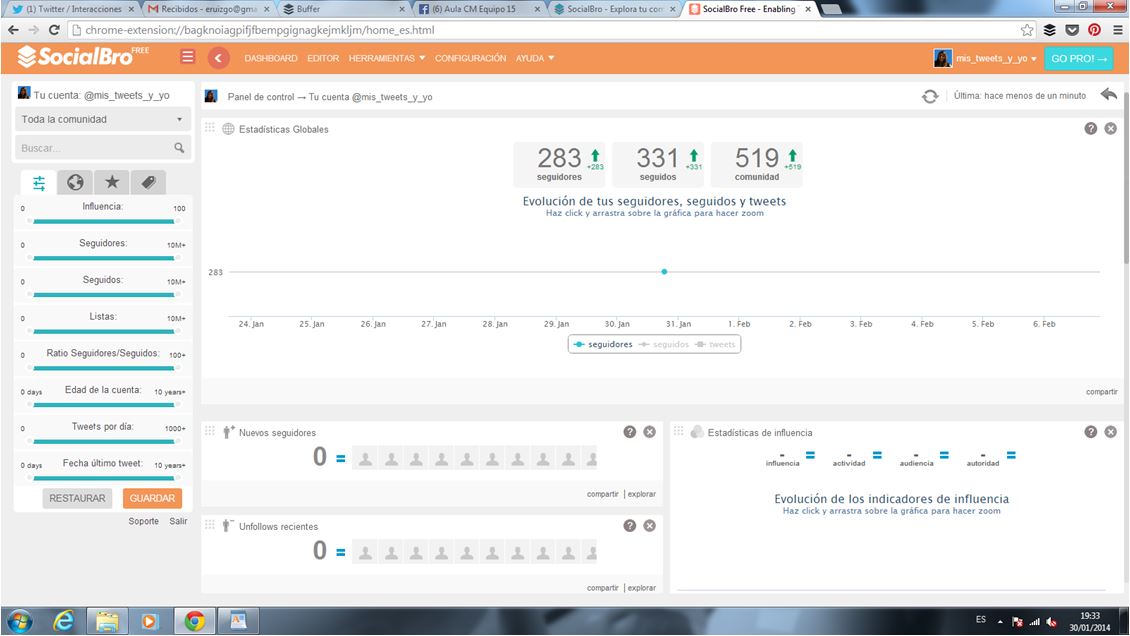 Si volvemos al escritorio veremos que tenemos otros datos muy relevantes (excepto para cuentas nuevas porque la herramienta no tiene referencia para comparar). Por ejemplo, datos de Influencia, actividad, audiencia y autoridad (esta última, por encima de 60, implica que mucha gente retuitea al usuario o lo pone como favorito).