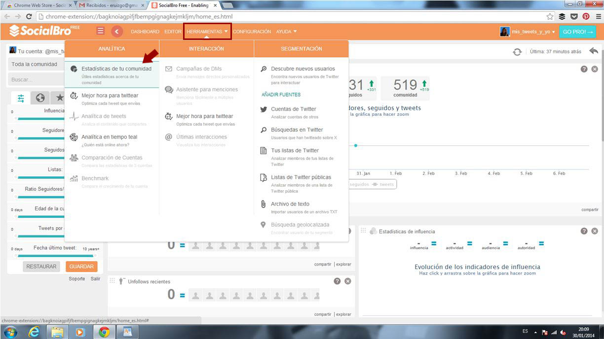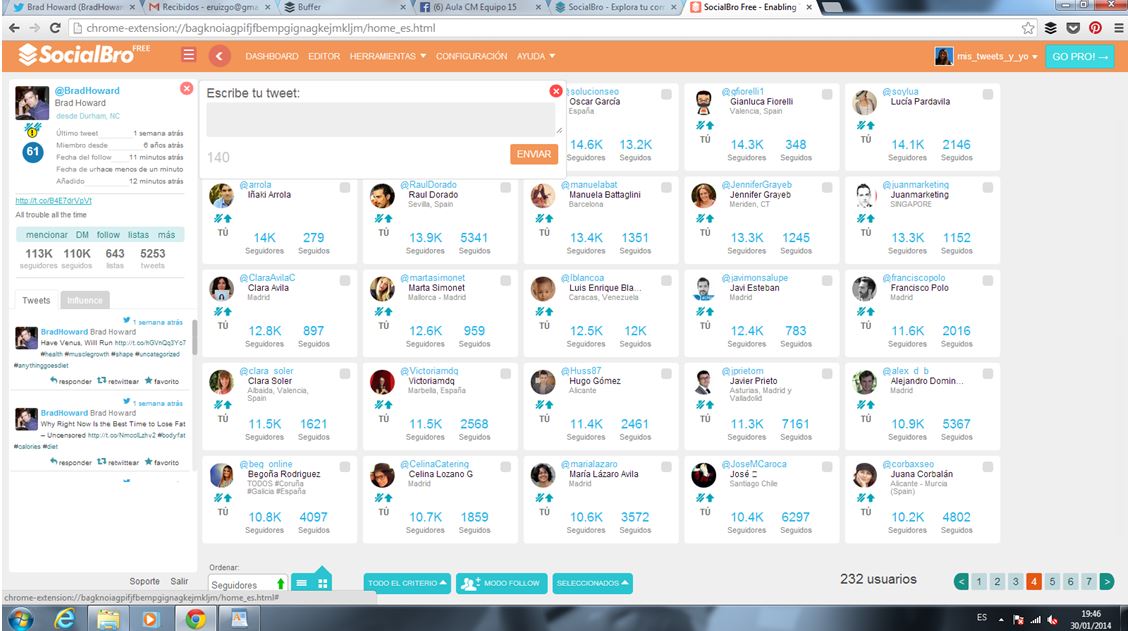 Volvemos de nuevo con otra herramienta específicamente diseñada para Community Managers activos en Twitter; en concreto, para gestionar y analizar nuestra comunidad: SocialBro. Un completo cuadro de mandos diseñado en España por un grupo de ingenieros cordobeses liderados por @javierburon