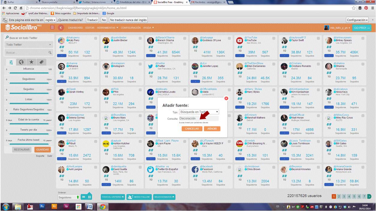 Seleccionaremos del desplegable «En todo twitter» y nos saldrá la misma pantalla que anteriormente hemos visto en Herramientas > Segmentación > Búsquedas en twitter con todos los usuarios del mundo ordenados por número de seguidores.
