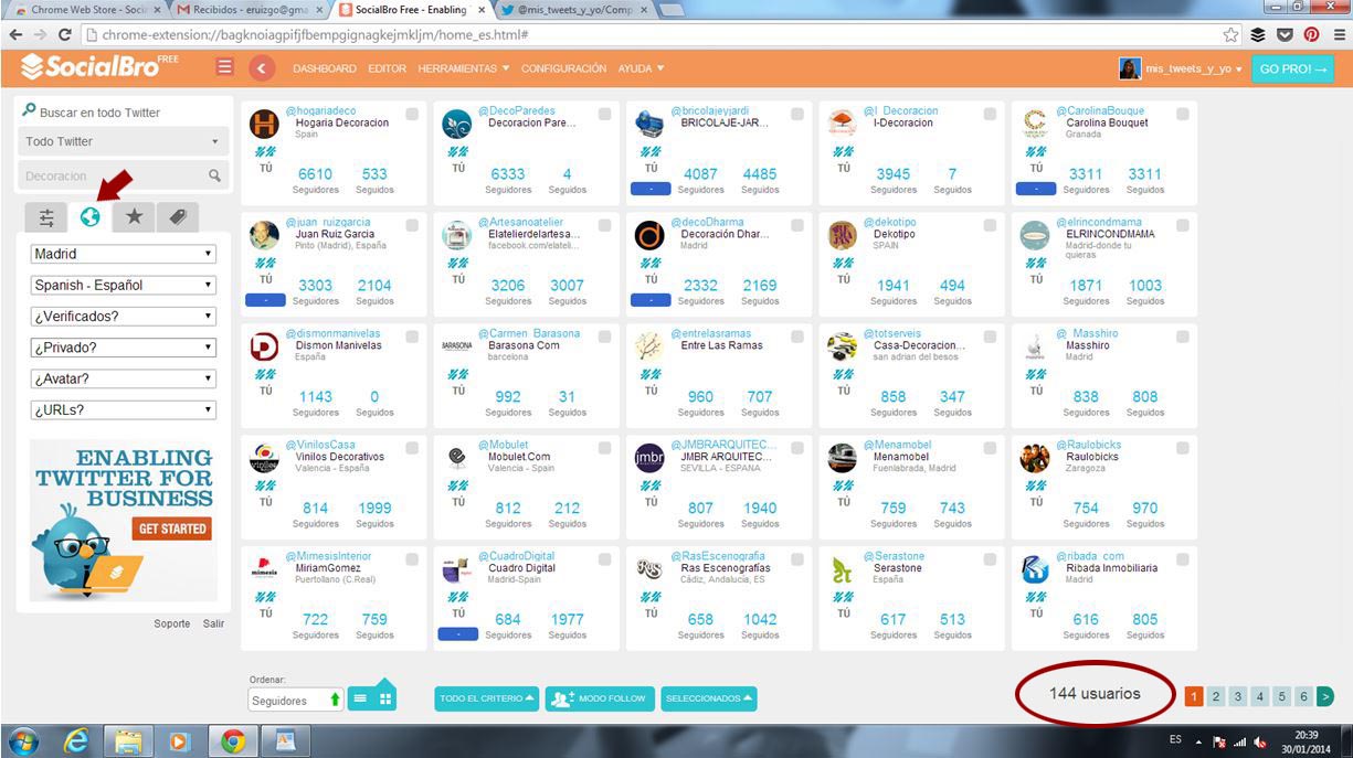 A continuación, en el mismo panel izquierdo escribiremos la palabra que nos interese (ej. Decoración) y se nos despliega un recuadro por si queremos colocar el nombre, bio y localizador. Por el momento lo dejamos en blanco, pulsamos el botón Search (Búsqueda) y nos saldrá el listado completo de usuarios que salen todos los que tengan esa palabra en el nombre o en la descripción: